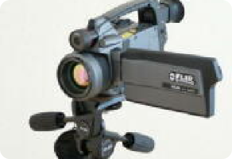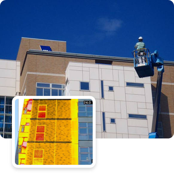 赤外線サーモグラフィーにより、外壁の表面温度差により、浮きを識別します。広い範囲を短時間に効率的に調査でき、高所作業もないので安全な方法です。ビルが近接して建設されている場合には、測定できません。
